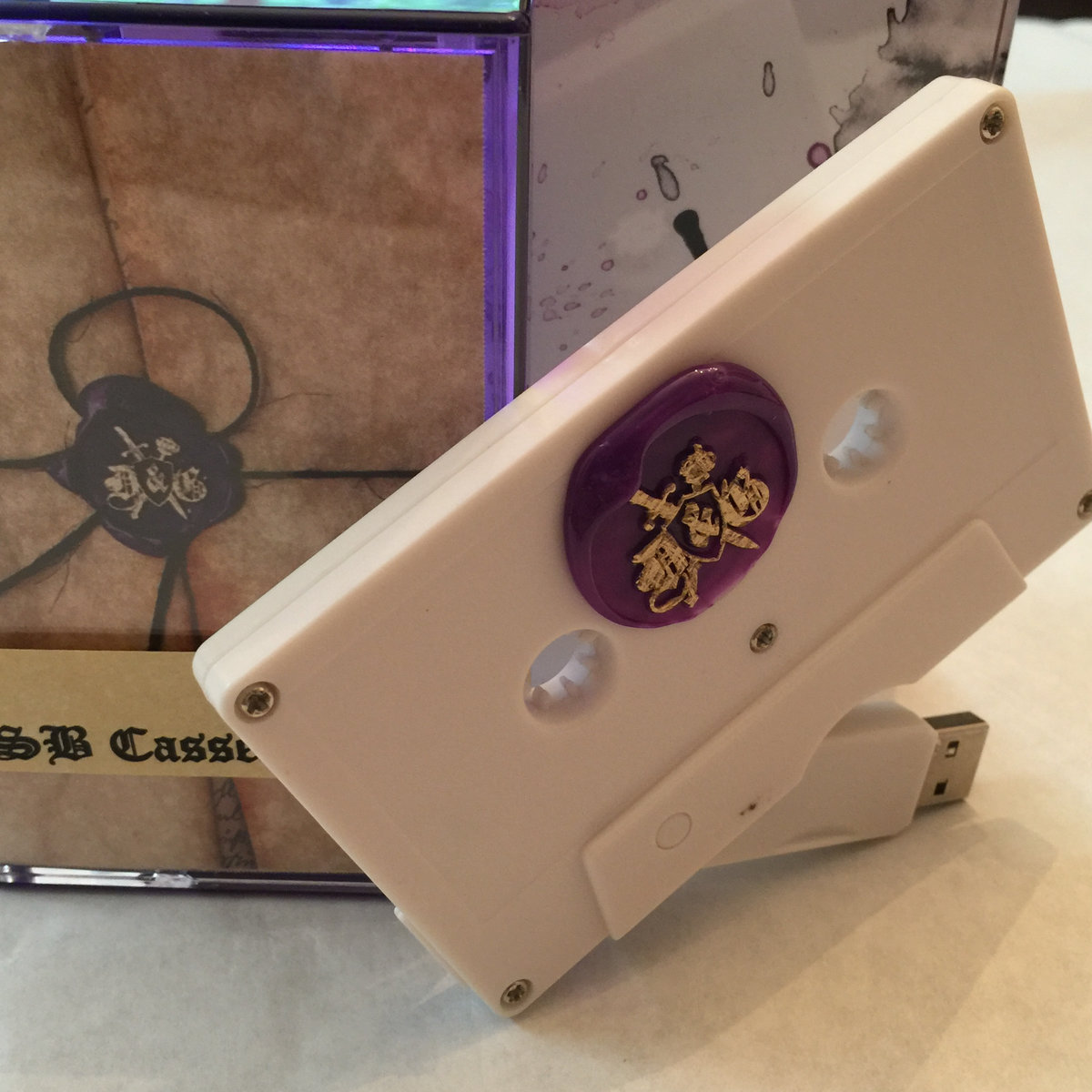 Limited edition USB cassette drive. This USB drive features 8GB of storage and comes loaded with "The Scepter & The Sword," b-sides, the "Something's Coming..." mixtape and other projects from Dawhud & Ace-One. Housed in a purple tape case and sealed with a hand pressed wax seal, this item is certified fresh.